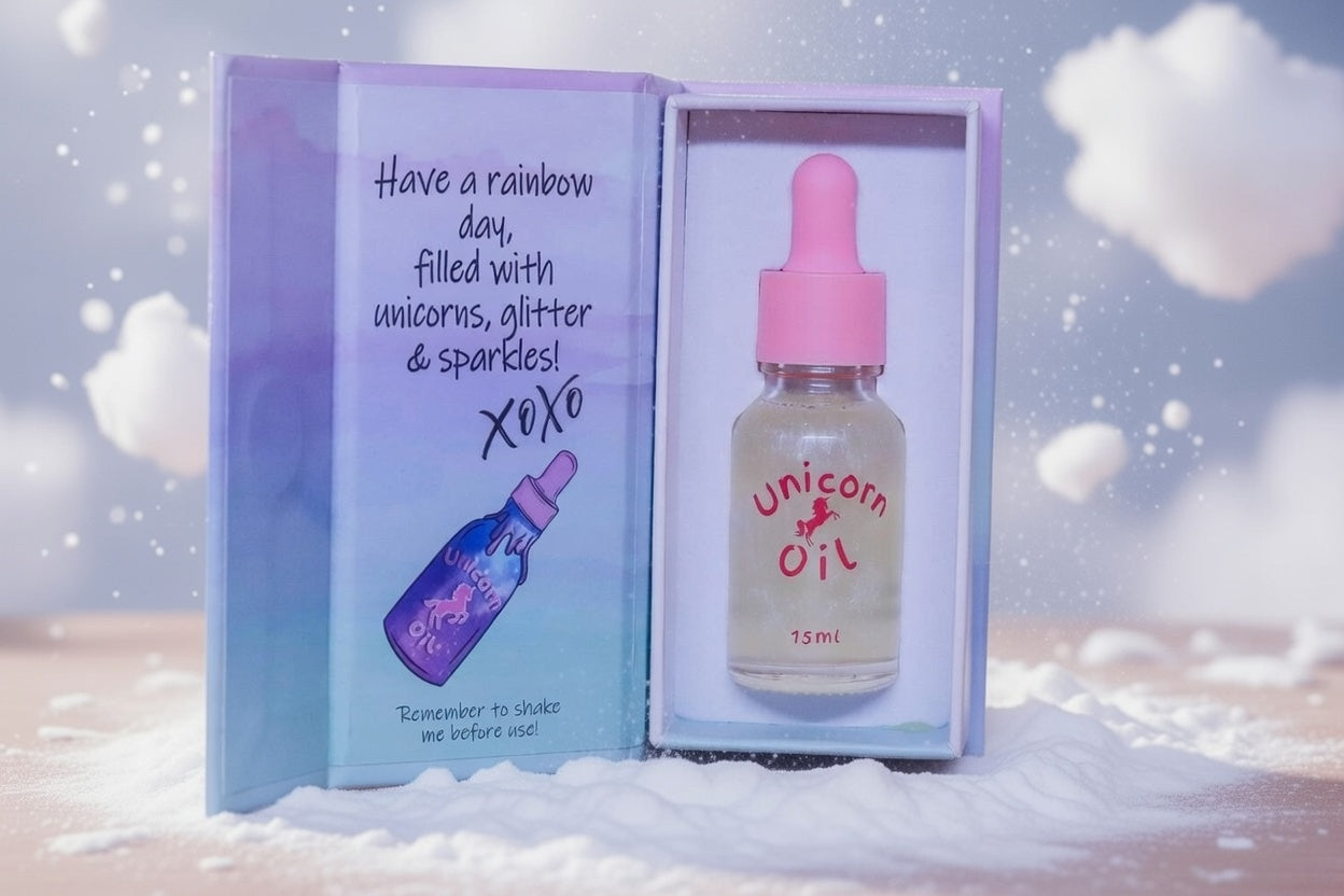 This stunning unicorn inspired cuticle oil comes in either a 3ml smooth twist pen, 5ml,15ml or 30ml glass dropper.