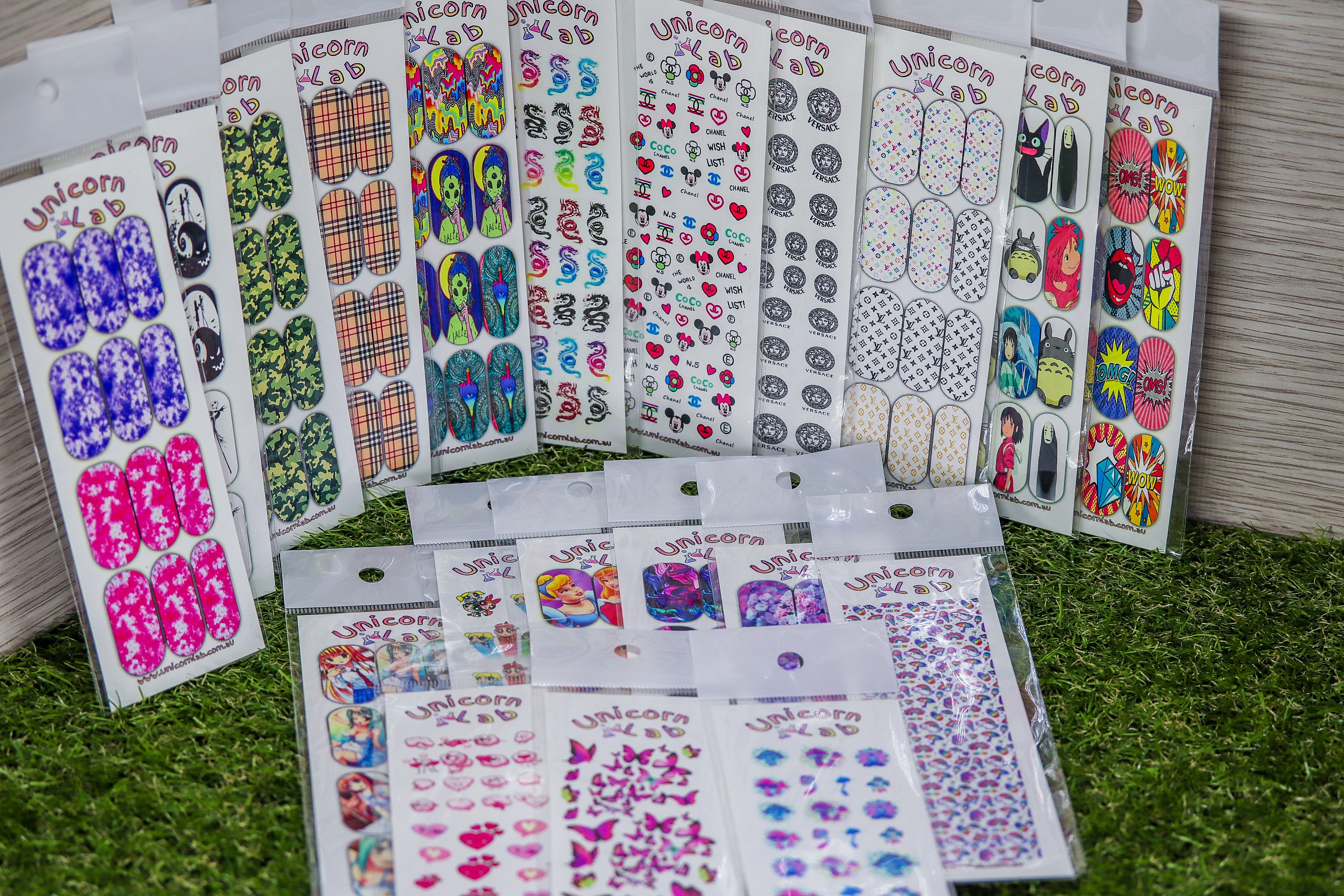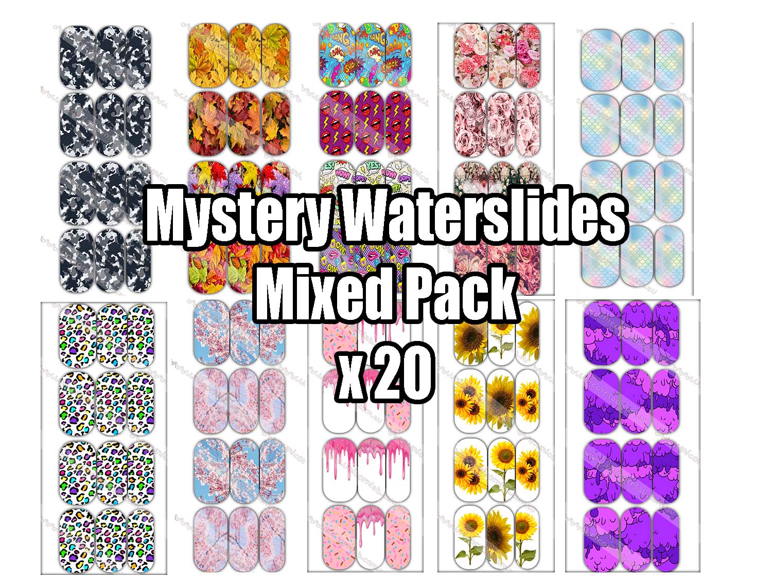 This pack contains 10 mini and 10 large waterslide decals. A mixture of textures patterns, logos and characters.